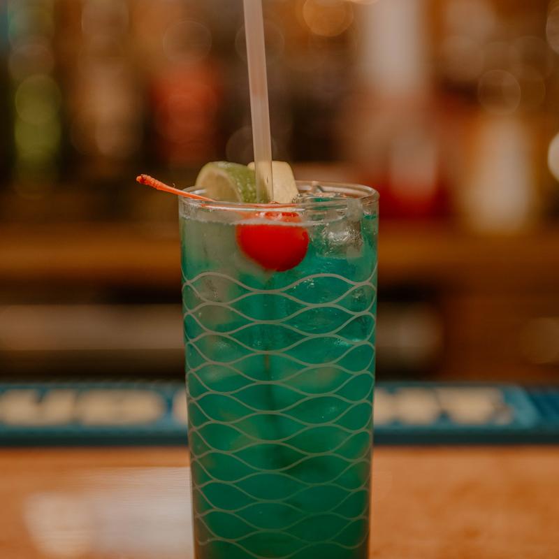 Captian morgan, coconut rum, melon liqueur, pineapple juice, blue curacao.