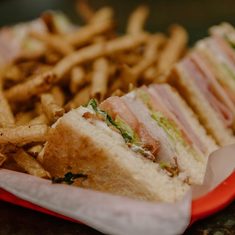 Ham, turkey, bacon, yellow & white American cheese, lettuce, tomato & mayo sandwiched between 3 pieces of Texas toast