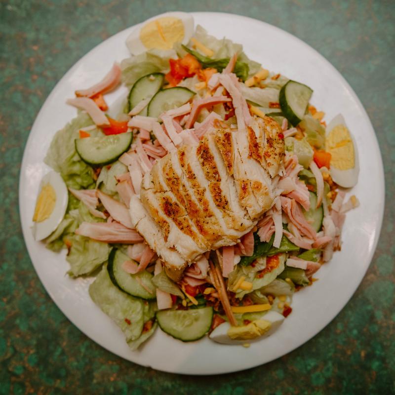 Ham, turkey, boiled egg, shredded cheese, tomatoes, cucumbers & bacon over a crisp bed of lettuce