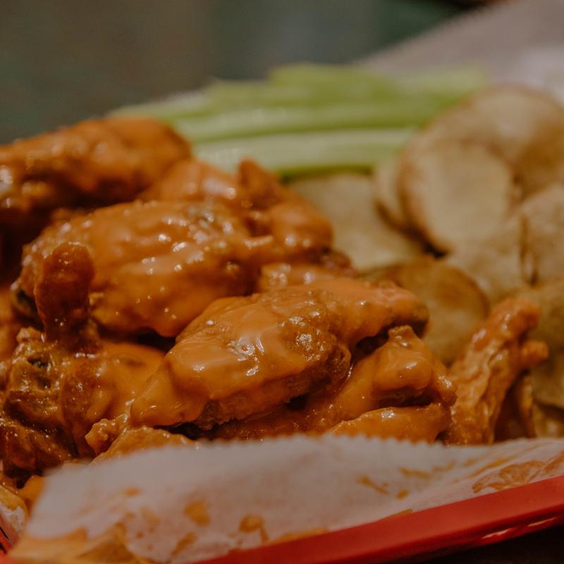 Crispy fried chicken wings with your choice of wing sauce. Includes: celery, dressings & (1) side