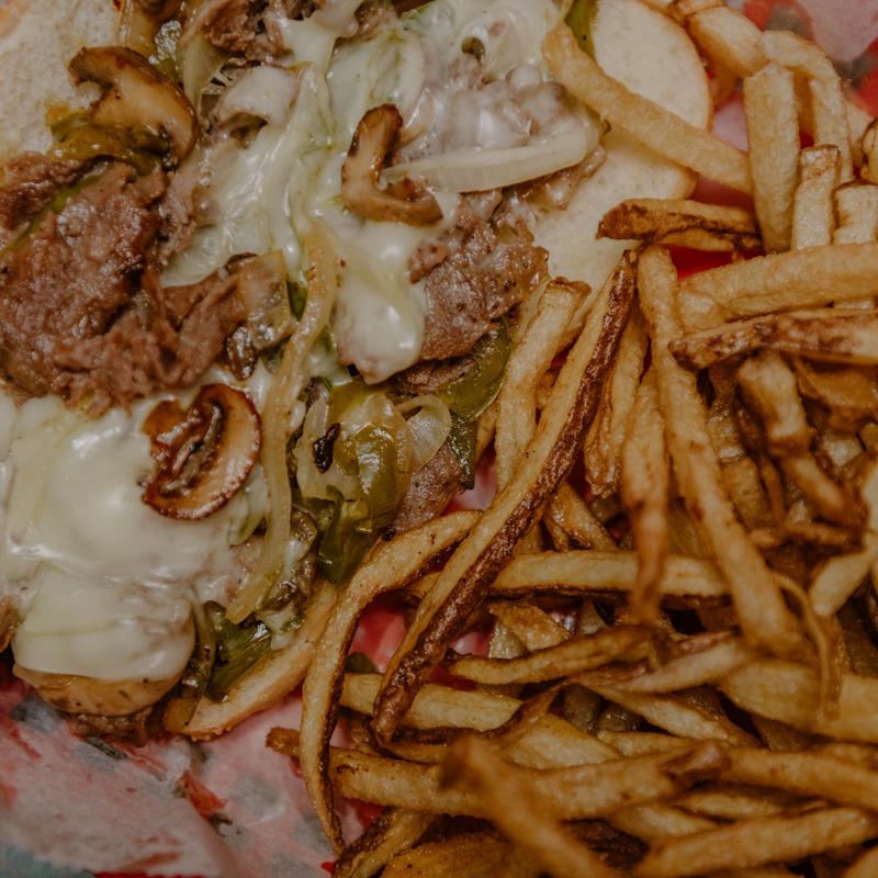 Melted white American, grilled onions, green peppers & mushrooms on a hoagie roll