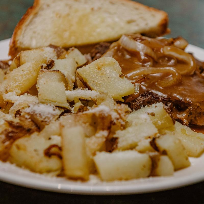 Fresh, locally sourced, 100% all-beef patty, well-seasoned & smothered in grilled onions & brown gravy. Includes your choice of (2) sides and Texas toast | Add Mushrooms, Jalapenos, or Bell Pepper for $1.00 each.