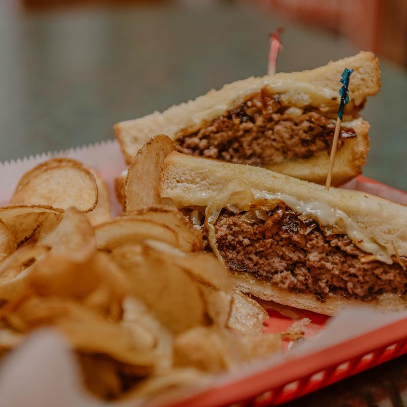 Fresh and juicy, handcrafted, 100% locally sourced ground beef with mayo, melted white American cheese, topped with grilled onions on Texas toast, or try it with grilled chicken